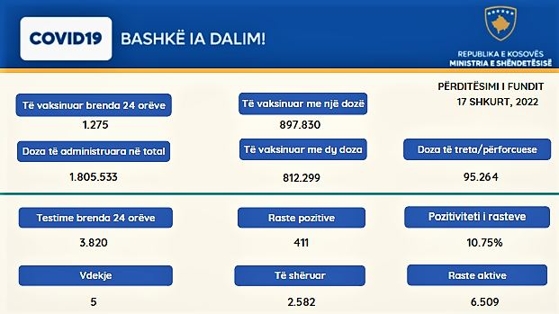 Ministria e Shëndetësisë, sipas të dhënave nga Instituti Kombëtar i Shëndetësisë Publike të Kosovës, informon se brenda 24 orëve të fundit kanë rezultuar pozitiv 411 persona me COVID-19.