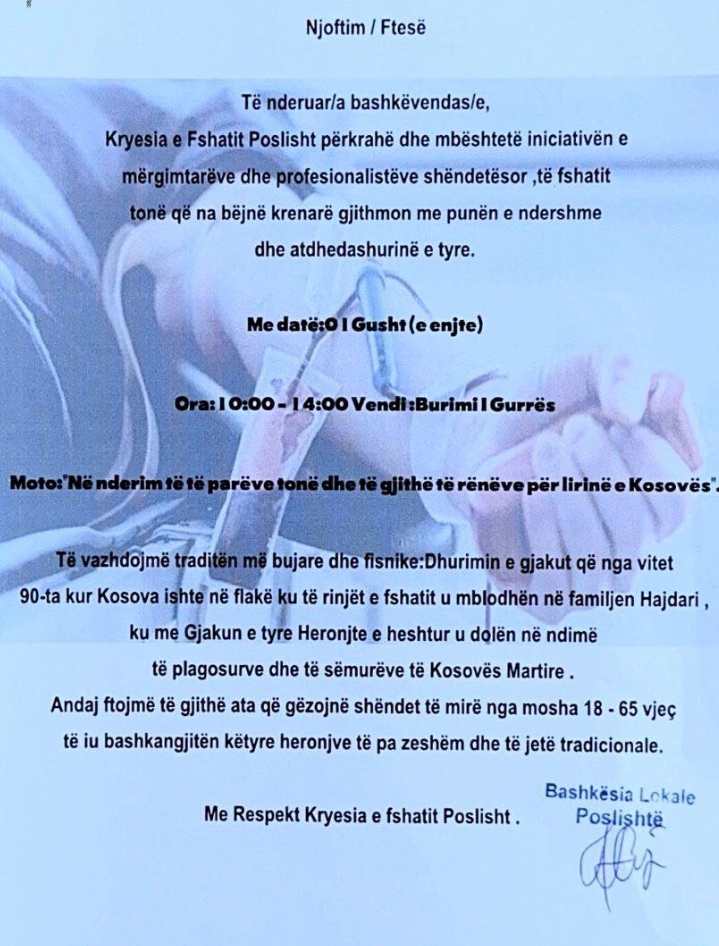 Në fshatin Poslisht të Prizrenit, me iniciativën e mërgimtarëve dhe profesionsitëve shëndetësor të fshatit, të enjten do të dhurohet gjak për nder të të rënëve për lirinë e vendit dhe që të vazhdohet tradita e të rinjëve të këtij fshati që u dolën në ndihmë të plagosurve dhe të sëmurëve në kohët më të vështira të popullit të Kosovës gjatë viteve të 90-ta.