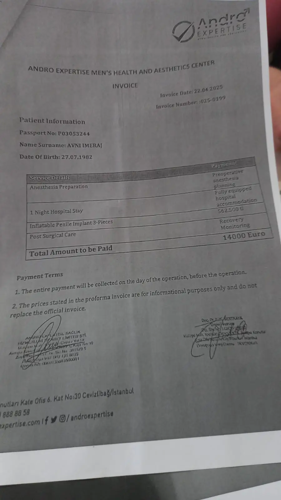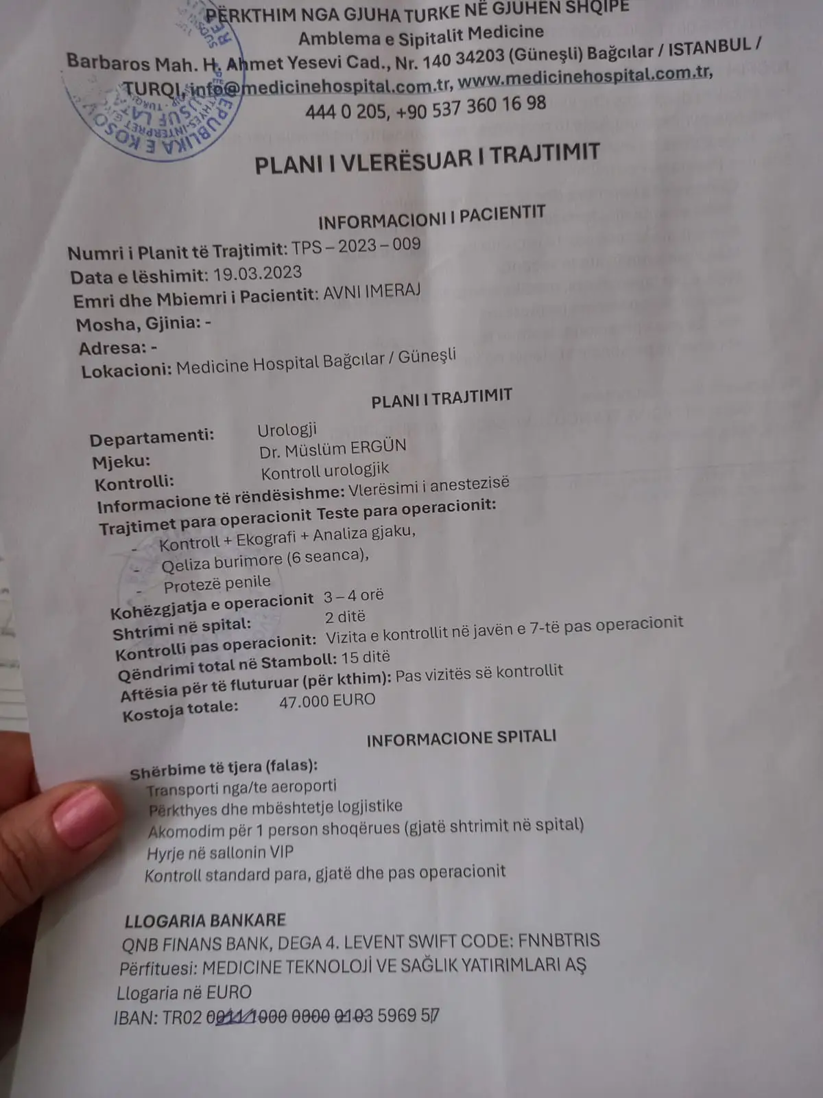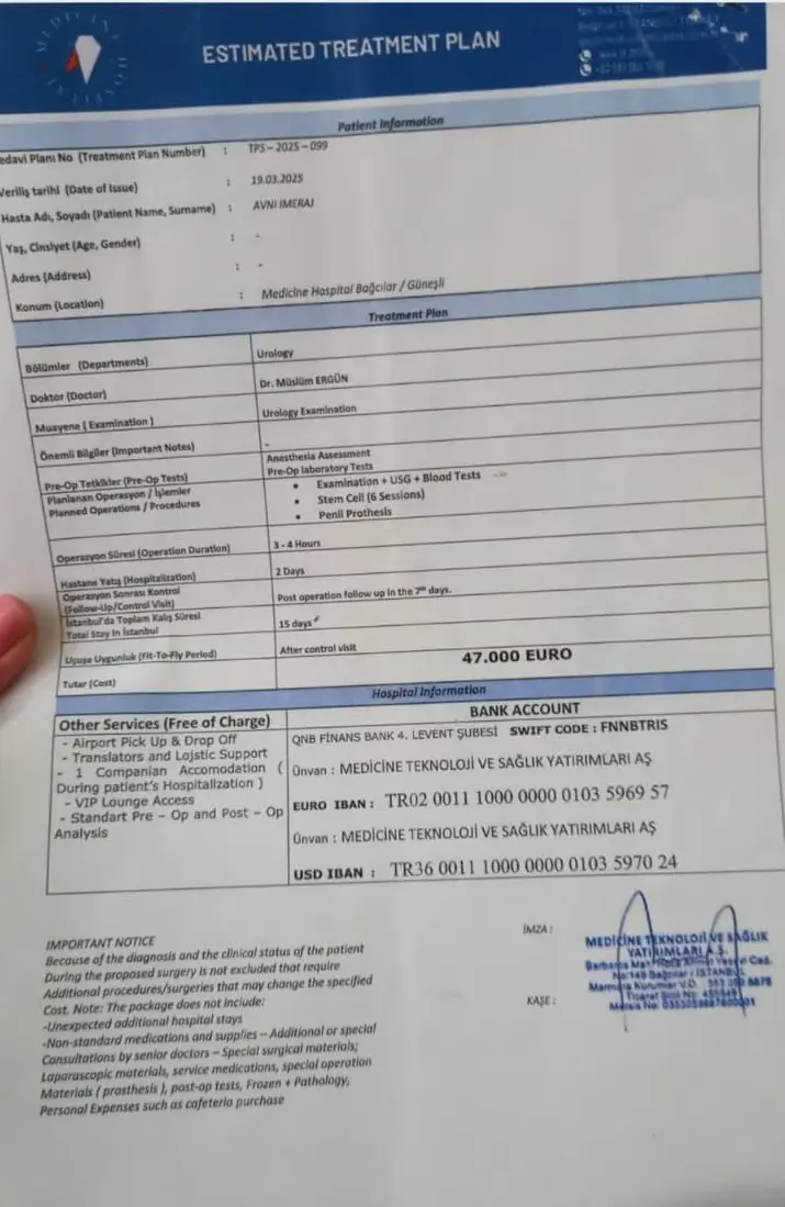 Sipas dokumentacionit mjekësor nga Medicine Hospital në Stamboll, Avni Imeraj është planifikuar për trajtim në repartin e Urologjisë. Trajtimi përfshin ekzaminime të detajuara, analiza laboratorike, ndërhyrje kirurgjikale dhe kujdes pas operacionit, me një kosto totale prej 47 mijë euro.