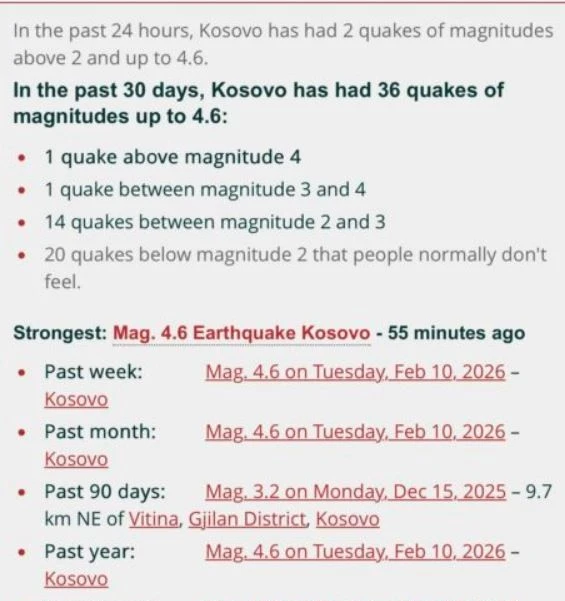 Sipas VolcanoDiscovery, tërmeti më i fortë i regjistruar të martën, me epiqendër në zonën e Shtërpcës, me 4.6.