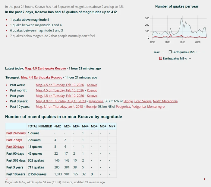 Të dhënat statistikore tregojnë se gjatë 12 muajve të fundit në Kosovë dhe zonat përreth janë regjistruar mbi 300 tërmete të magnitudave të ndryshme, shumica prej tyre me intensitet të ulët.