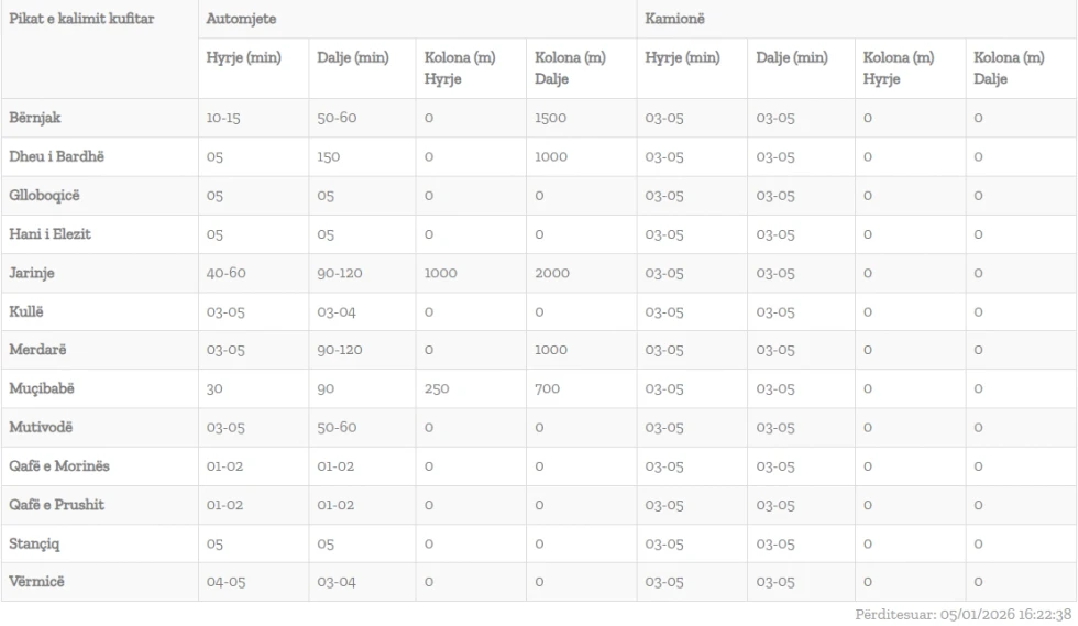 Në pothuajse të gjitha pikat kufitare të Kosovës për dalje, ka pritje të gjata. Aktualisht, më e ngarkuara sipas Qendrës Kombëtare për Menaxhimin Kufitar është pika kufitare Dheu i Bardhë ku pritja për të dalë nga Kosova është dy orë e gjysmë.