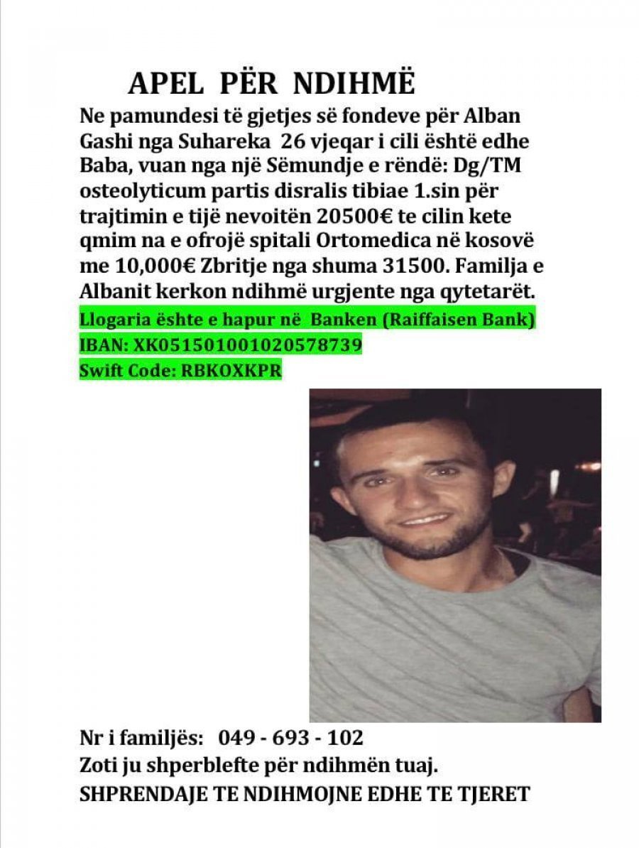 Alban Gashi 26 vjeçar nga Suhareka vuan nga një sëmundje e rëndë, osteolyticum partis disralis tibiae 1.sin dhe për trajtimin e tij nevojitën 20 mijë e 500 euro, shumë të cilën familja nuk e posedon.