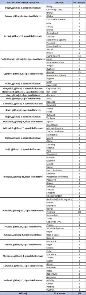 Rastet pozitive janë nga komuna Prishtinë 117 raste, komuna Gjakovë 28 raste, komuna Ferizaj 19 raste, komuna Fushë Kosovë 19 raste, komuna Podujevë 18 raste, komuna Pejë 12 raste, komuna Vushtrri 11 raste, komuna Drenas 8 raste, komuna Mitrovicë 7 raste, komuna Shtime 6 raste, komuna Obiliq 5 raste, komuna Prizren 5 raste, komuna Junik 4 raste, komuna Skenderaj 4 raste, komuna Kamenicë 3 raste, komuna Rahovec 3 raste, komuna Suharekë 3 raste, komuna Deçan 2 raste, komuna Gjilan 2 raste, komuna Klinë 2 raste, komuna Lipjan 2 raste dhe me nga një rast komunat Graçanicë, Han i Elezit, Istog dhe Malishevë.