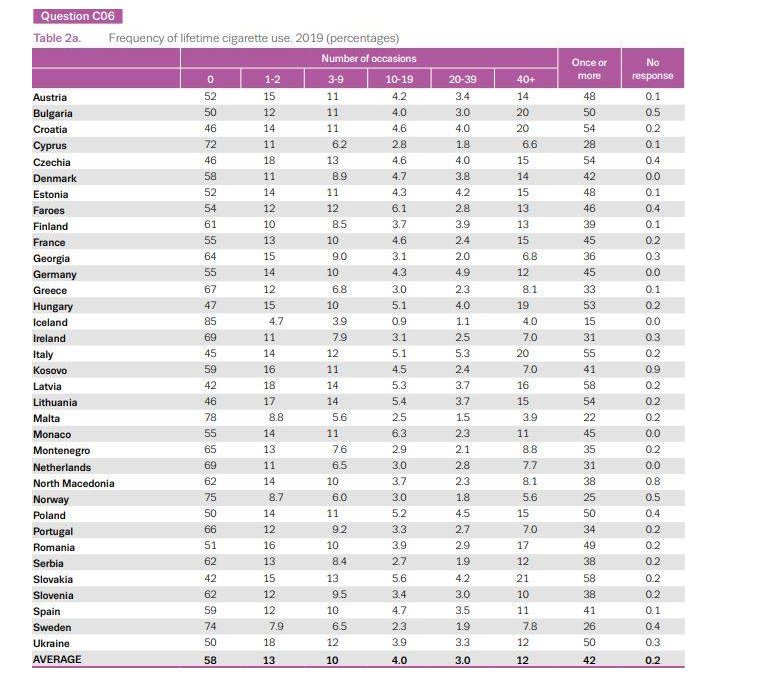 Sipas një raporti të “European School Survey Project on Alcohol and other Drugs (ESPAD)” deri në vitin 2019, 41 për qind e kosovarëve e kanë pirë së paku njëherë cigaren.