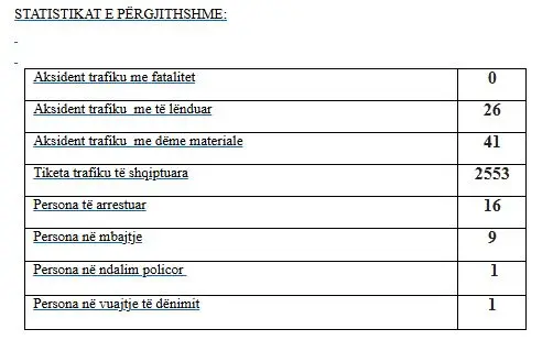 Sipas raportit të policisë, në këtë periudhë nuk është shënuar asnjë aksident trafiku me fatalitet, ku 26 kanë qenë me lëndime, ndërsa 41 me dëme materiale.