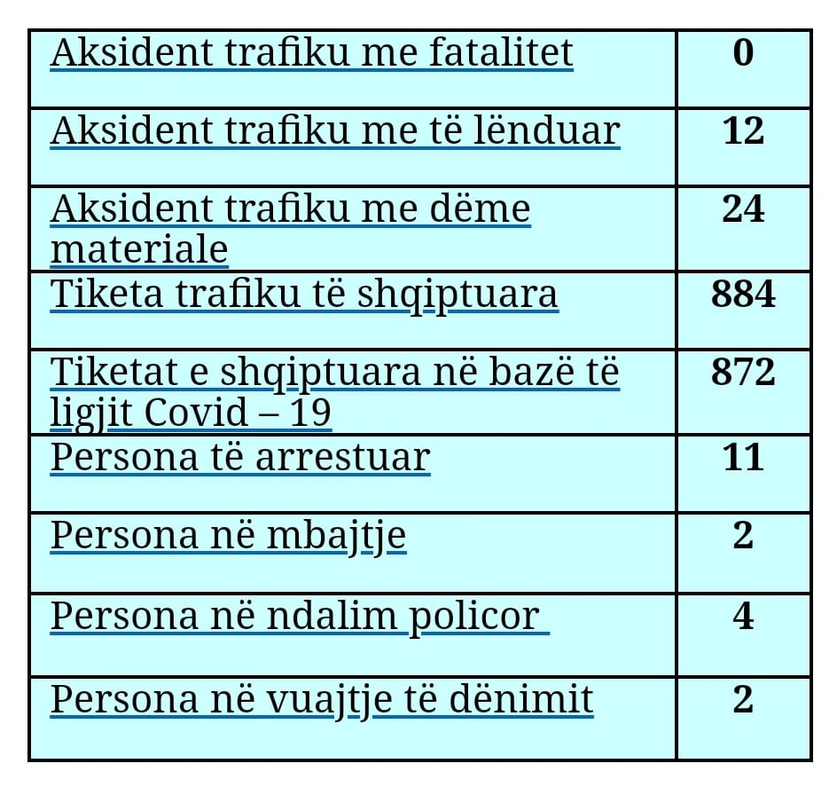 Veç kësaj policia ka shqiptuar edhe 884 tiketa trafiku.Në raportin 24 orësh, policia ka njoftuar se janë 0 aksidente trafiku me fatalitet dhe 12 me të lënduar.