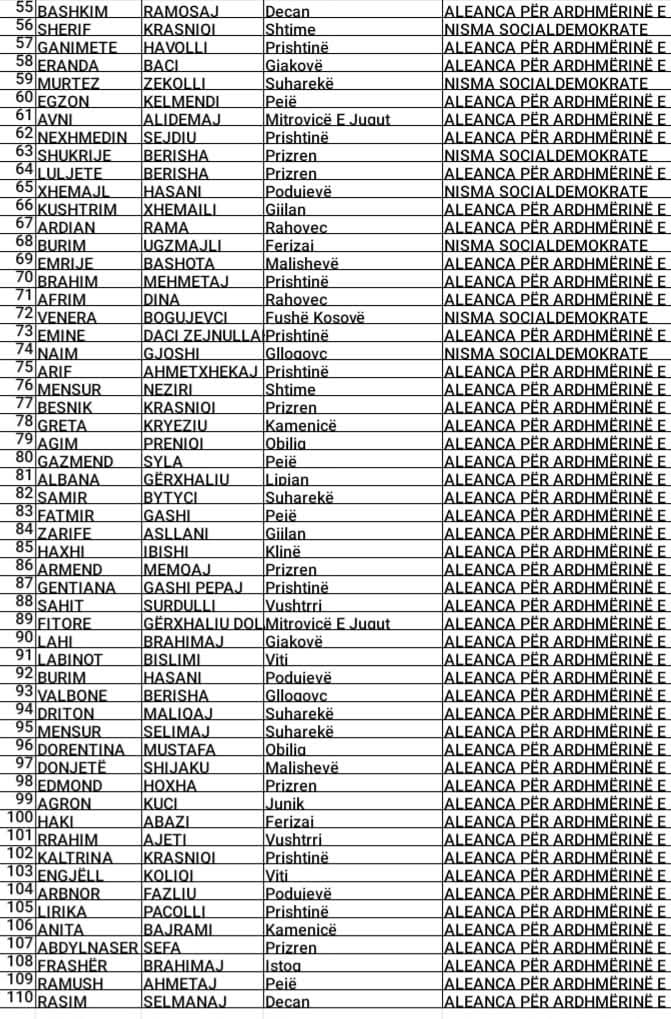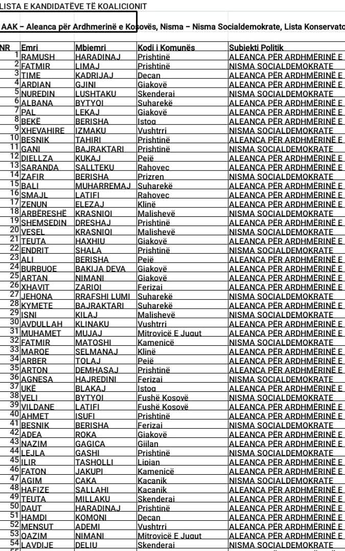 Lista e Koalicionit AAK – Nisma Socialdemokrate – Konservatorët – E30 dhe Ideal, ka publikuar listën me kandidatët për deputet.