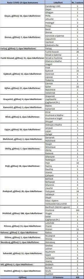 Rastet pozitive janë nga komuna Prishtinë 188 raste, komuna Gjakovë 32 raste, komuna Fushë Kosovë 31 raste, komuna Podujevë 28 raste, komuna Gjilan 27 raste, komuna Pejë 18 raste, komuna Deçan 16 raste, komuna Prizren 13 raste, komuna Suharekë 12 raste, komuna Lipjan 10 raste, komuna Drenas 7 raste, komuna Obiliq 7 raste, komuna Klinë 6 raste, komuna Shtime 5 raste, komuna Graçanicë 4 raste, komuna Ferizaj 3 raste, komuna Vushtrri 3 raste, komuna Kamenicë 2 raste, komuna Malishevë 2 raste, komuna Rahovec 2 raste dhe me nga një rast komunat Skenderaj dhe Viti.