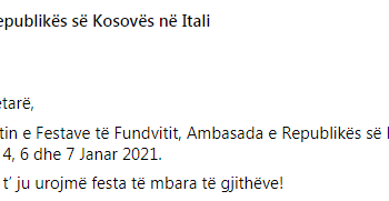 Në njoftim thuhet se me rastin e festive të Fundvitit, Ambasada e Republikës së Kosovës në Romë do të jetë e mbyllur më 1, 4, 6 dhe 7 Janar të viti 2021.Pra, nga kjo kohë, Ambasada nuk mund të kryen shërbime për qytetarët tanë.