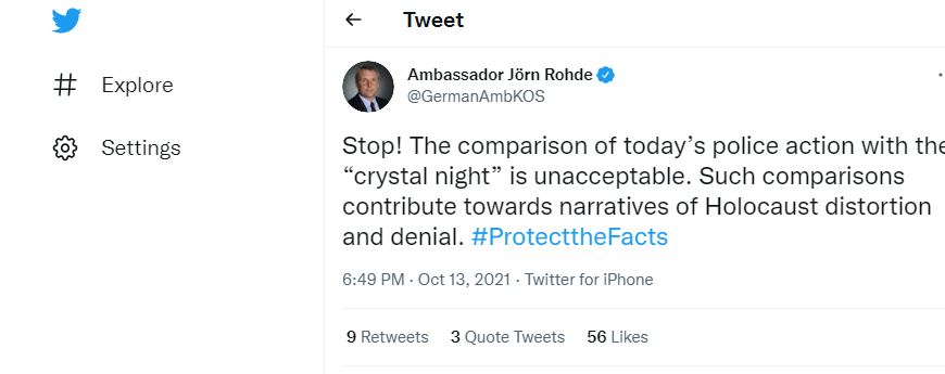Përmes një publikimi në Twitter, Rohde tha se është i papranueshëm krahasimi i aksionit të sotëm të policisë me “natën e kristaltë”.