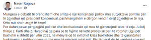 Por duhet pasur përgjegjësi politike dhe institucionale që mos të gjenerojmë kriza të reja. Ju bëj thirrje z. Kurti dhe z. Haradinaj që para se të hyjmë në këtë proces së pari të votohet Ligji për Buxhetin e shtetit për vitin 2021, në mënyrë që të evitohet kriza buxhetore dhe të garantohet funksionimi i institucioneve si dhe mos të pësojnë qytetarët. Për të tjerat do të vendosë sovrani!
