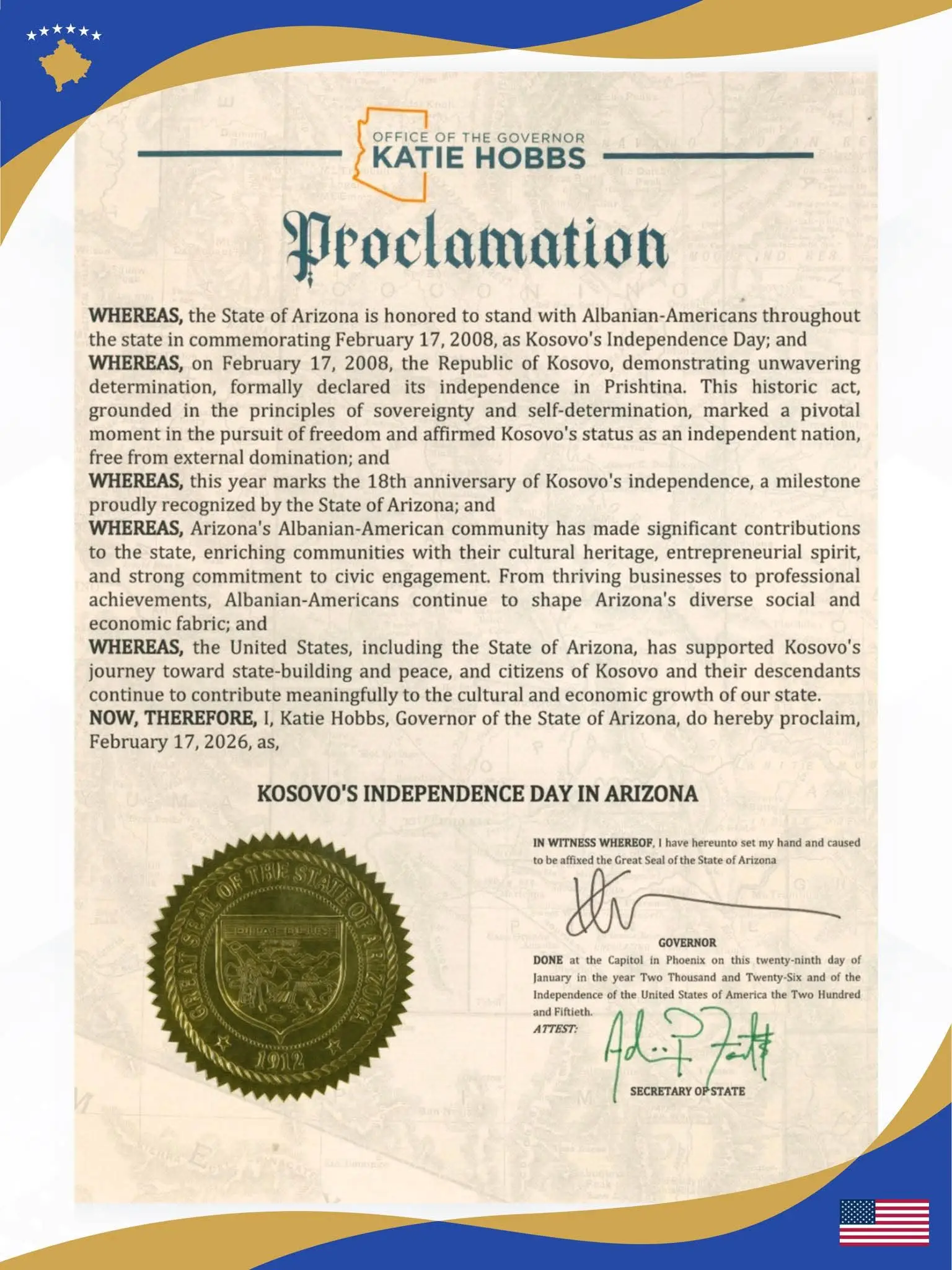 Në përfundim, guvernatorja Hobbs shpalli zyrtarisht 17 shkurtin 2026 si “Dita e Pavarësisë së Kosovës në Arizona”, duke e njohur këtë datë në nivel shtetëror dhe duke riafirmuar mbështetjen për vlerat e lirisë dhe pavarësisë.