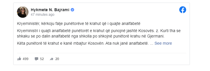 “Këta punëtorë të krahut e kanë mbajtur Kosovën. Ata nuk janë analfabetë. Janë larguar në vendet e BE e deri në Amerikë jo pse janë analfabetë. Janë plot arsye tjera pse janë larguar dhe po largohen edhe sot nga atdheu. Ka shembuj gjithandej të punëtorëve të krahut të zotë që sot kanë krijuar biznese të suksesshme në gjithë botën. Këta punëtorë krahu sjellin qindra miliona euro për Kosovën përmes remitencave! Prandaj, Kryeministër kërko falje!”, ka shkruar Bajrami.