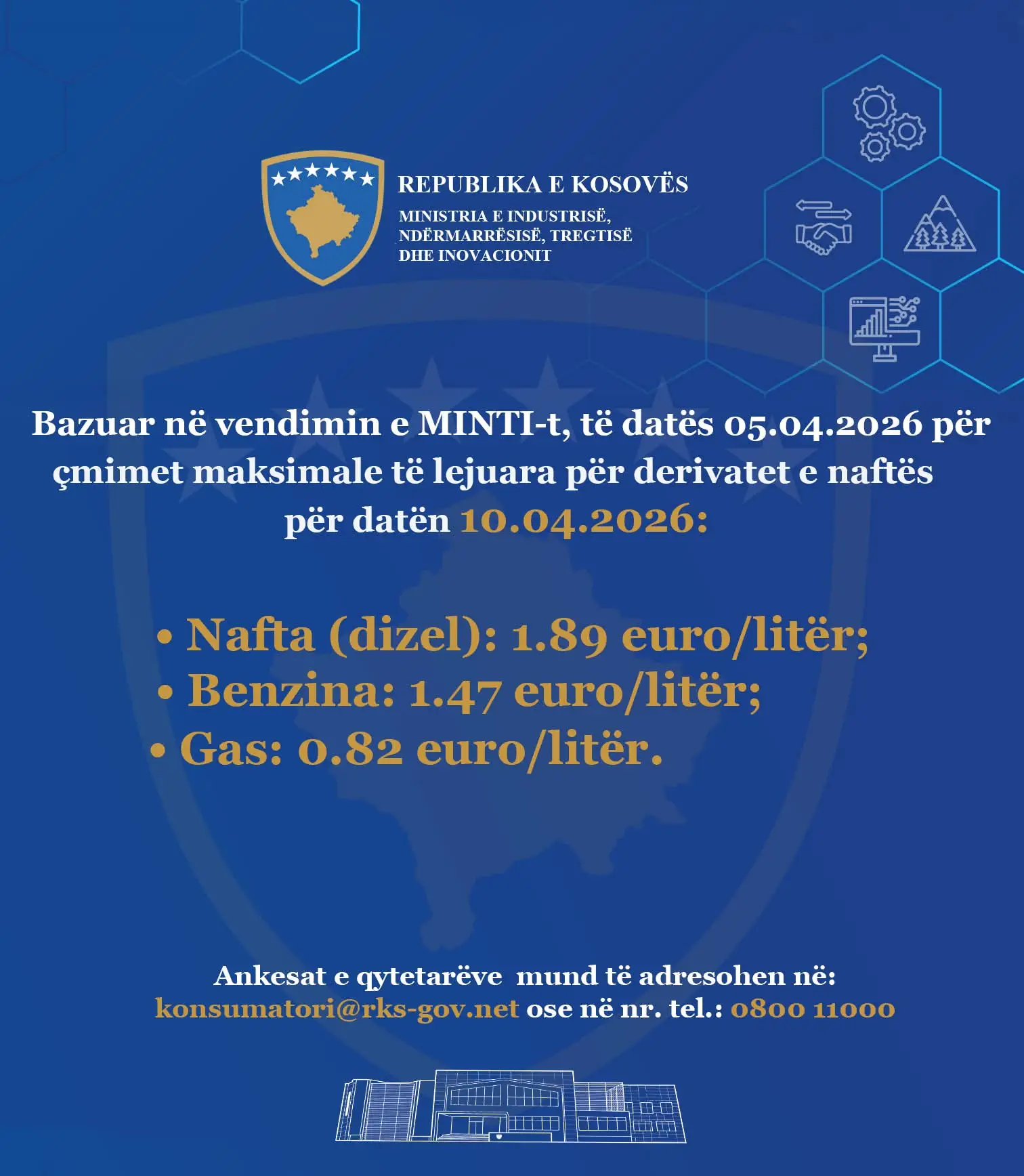 Nga 1.91 euro për litër sa ishte të enjten çmimi i naftës, të premten ky çmim është 1.89 euro për litër, sipas njoftimit nga Ministria e Industrisë, Ndërmarrësisë, Tregtisë dhe Inovacionit për çmimet maksimale të lejuara për derivatet e naftës në datën 10.04.2026.