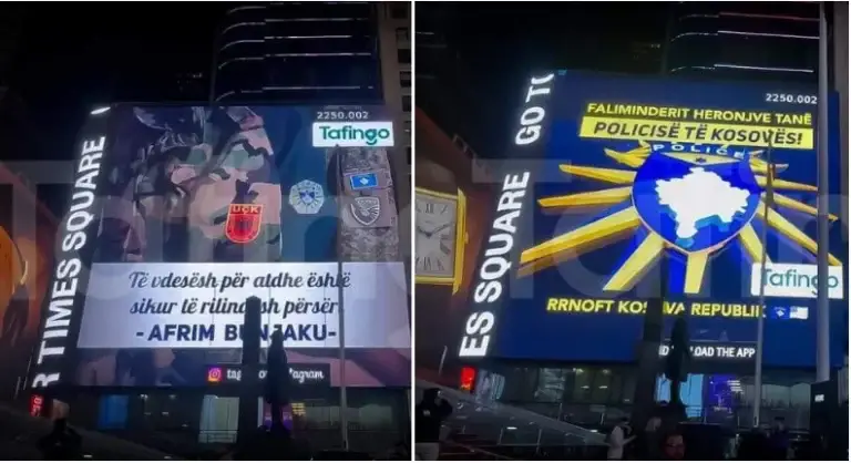 “Të vdesësh për atdhe është sikur të rilindësh përsëri – Afrim Bunjaku”, “Faleminderit heronjve tanë Policisë të Kosovës”, janë mesazhet që janë shfaqur në Times Square.