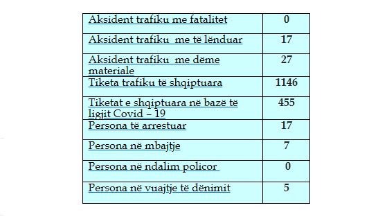 17 persona u arrestuan, shtatë persona u dërguan në mbajtje dhe pesë në vuajtje të dënimit.Gjatë 24 orëve të fundit në vendin tonë kanë ndodhur 17 aksidente trafiku me të lënduar dhe 27 aksidente me dëme materiale.