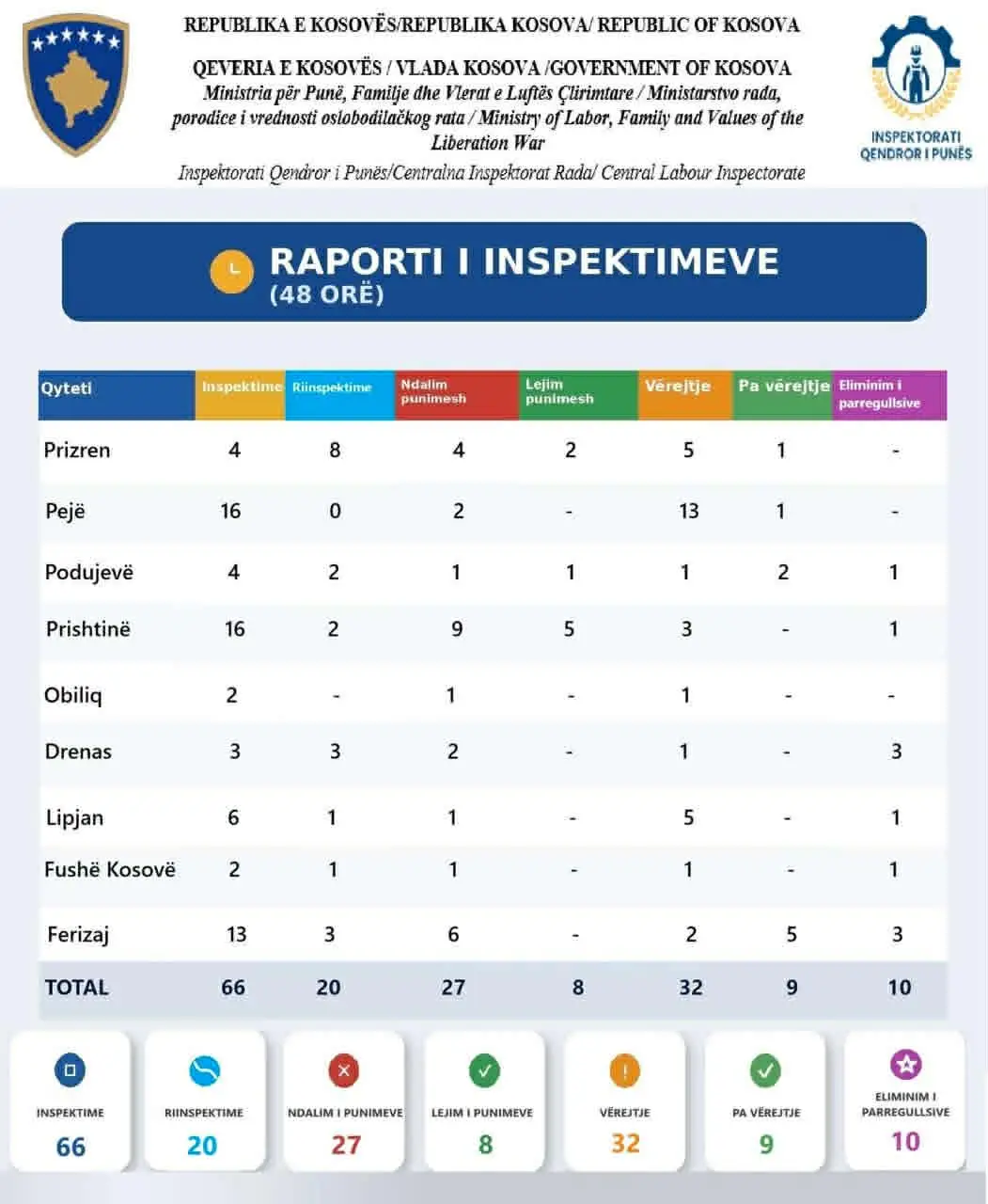 Inspektorati Qendror i Punës ka zhvilluar një aksion të jashtëzakonshëm inspektimi në sektorët me nivel të lartë rreziku, duke përfshirë tërë territorin e Kosovës.
