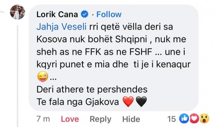 “Rri qetë vëlla, derisa Kosova nuk bëhet Shqipëri, nuk më sheh as në FFK, as në FSHF…Unë i shikoj punët e mia dhe ti je i kënaqur… Deri atëherë të përshëndes! Të fala nga Gjakova!”, shkroi ish-futbollisti i Paris Saint-Germainit, Marseilles, Sunderlandit, Galatasarayt, Lazios dhe Nantesit.