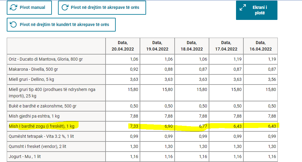 Aty shihet një kilogramë i këtij produkti kushtonte 6.43 euro më 17 prill të këtij viti. Tri ditë më vonë, me të 20-in, 7.33 euro.