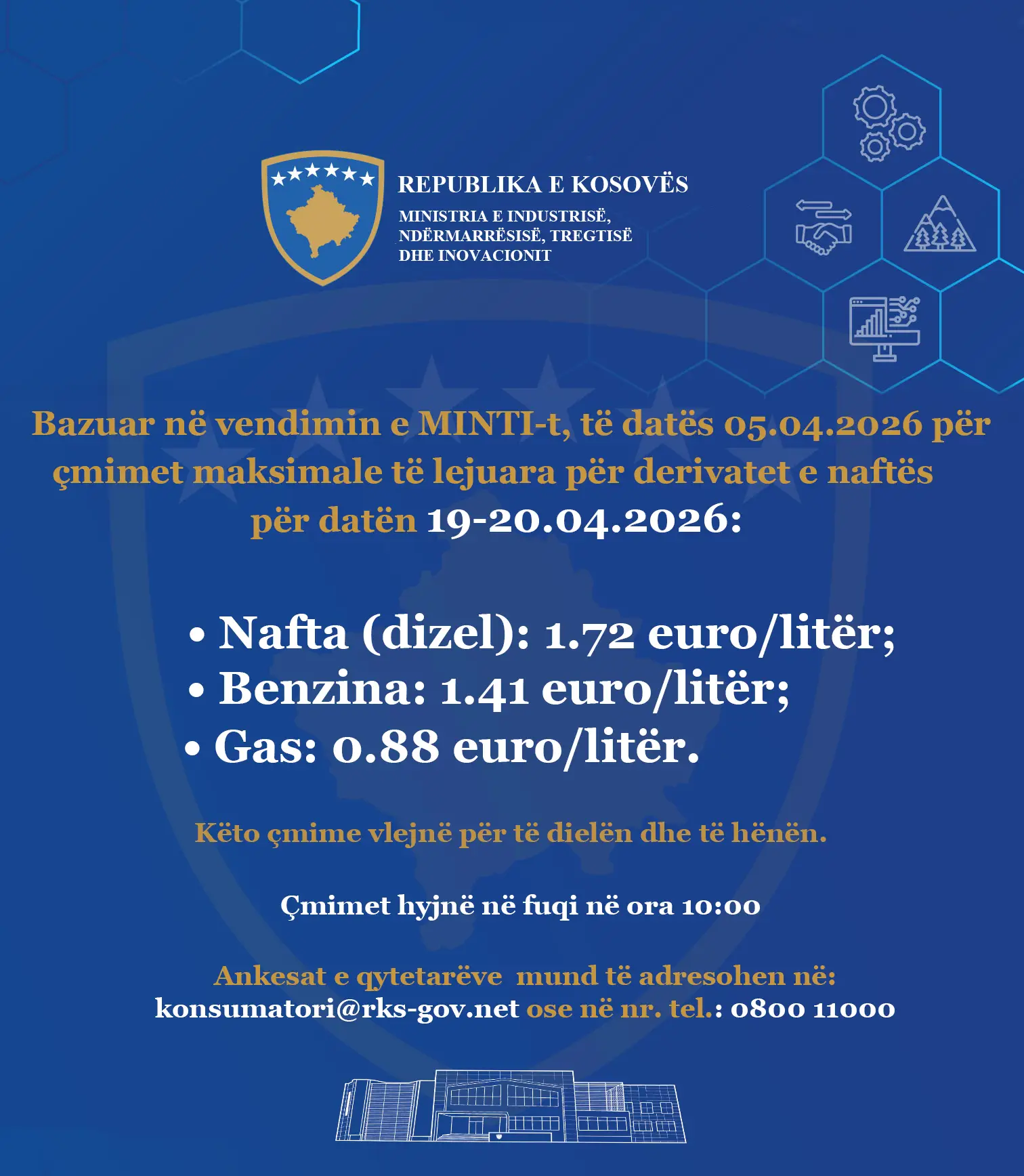 Nafta vazhdon të jetë 1.72 euro për litër, benzina 1.41 euro për litër dhe gazi 0.88 euro për litër.