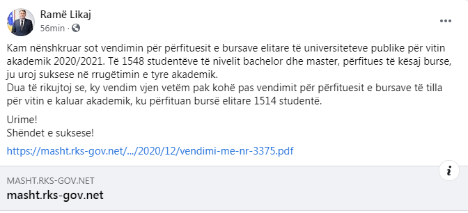 Ministri i Arsimit, Shkencës dhe Teknologjisë Ramë Likaj, ka nënshkruar vendimin për përfituesit e bursave elitare të universiteteve publike të Kosovës, për vitin akademik 2020/21.