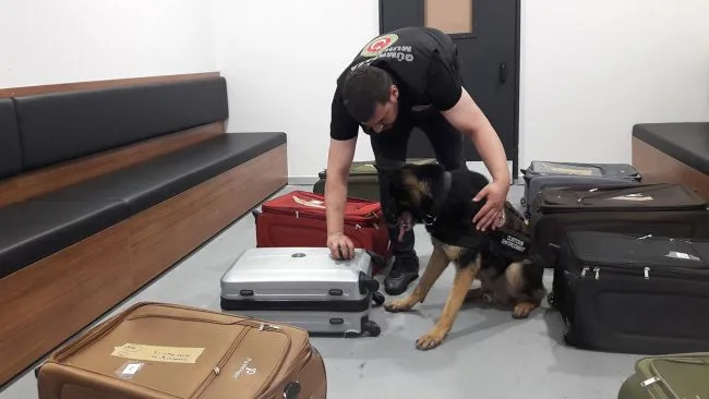 Këto janë momentet kur qentë antidrogë të policisë turke zbulojnë se në valixhet e dy shtetasve që vinin nga Shqipëria, fshihej ngarkesa e drogës prej rreth 31.5 kilogramë kanabis.