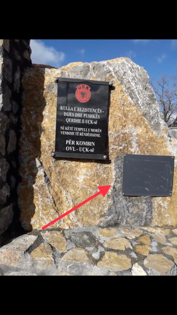 Në një gur ishin të vendosura dy pllaka me përshkrime mbi UÇK-në, dhe ndërsa njëra është shpërngulur më poshtë, tjetra është hequr plotësisht nga persona të papërgjegjshëm.