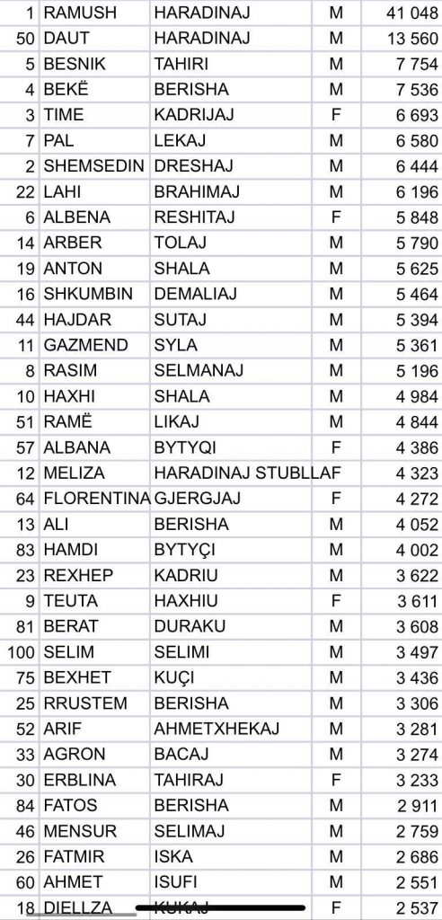 Rezultati i votave të kandidatëve të AAK-së për deputetë, para se të kryhej manipulimi i dyshimtë i flikove të Formularëve me Rezultatet e Kandidatëve