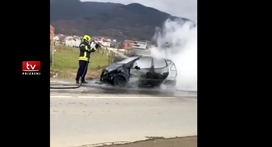 Në pamjet e dërguara në redaksinë e Televizionit të Prizrenit, shihet se si zjarrëfiksit janë duke shuar zjarrin përderisa e gjithë vetura ishte përfshirë nga flakët.