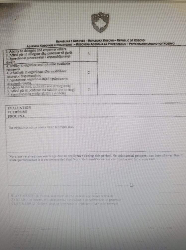 Në dokumentet që ka siguruar LAJME365 shihet e se njëjta në raportin e vlerësimit për perfomancën e saj është vlerësuar me nota 2 dhe 3, kështu duke i ndërprerë kontratën e punës.