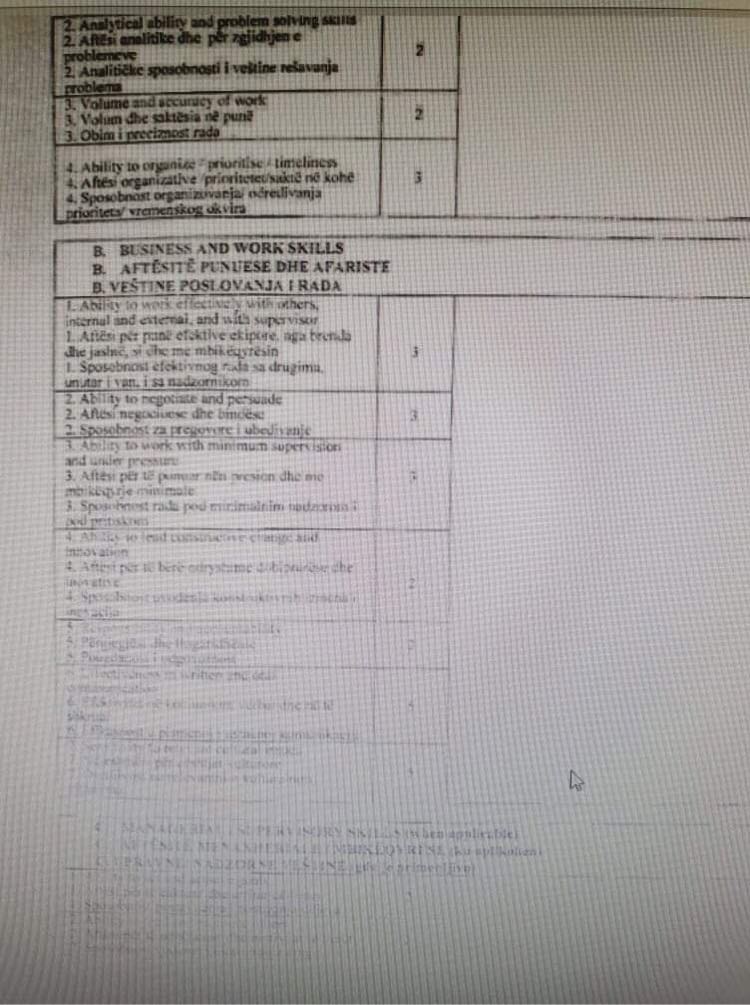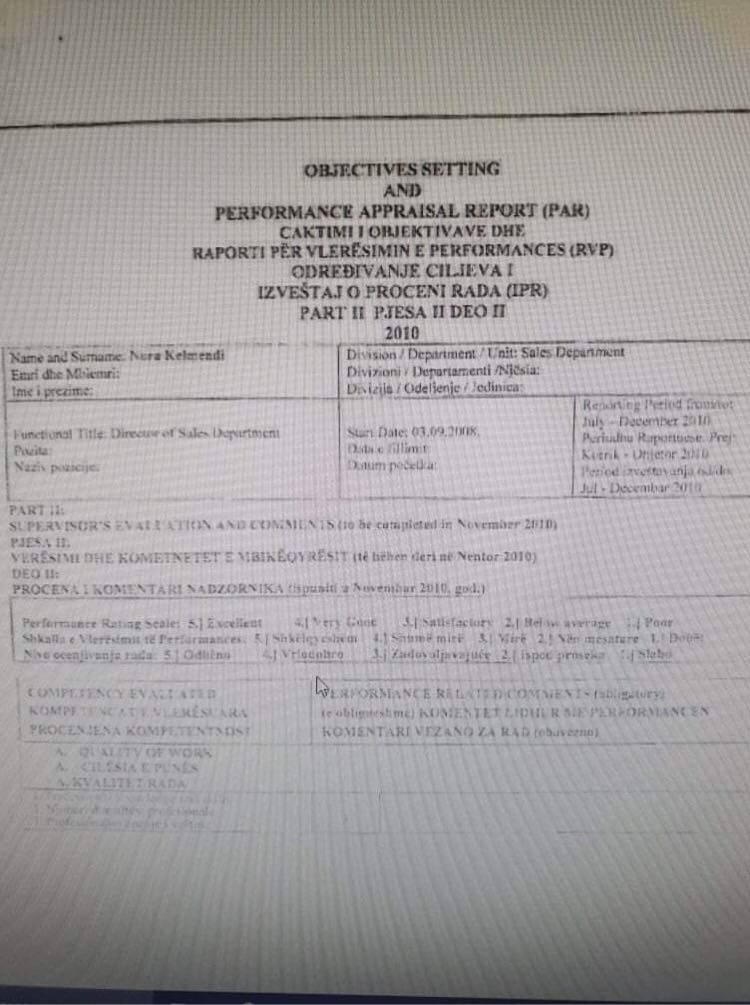 Në raportin për vlerësimin e perfomancës, në fushat për cilësinë e punës vlerësimi me nota nga 1 – 5 ka qenë si në vijim: