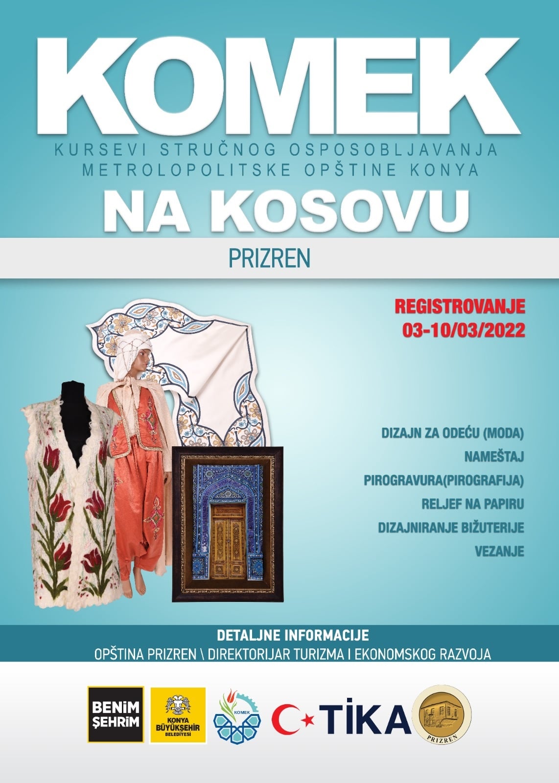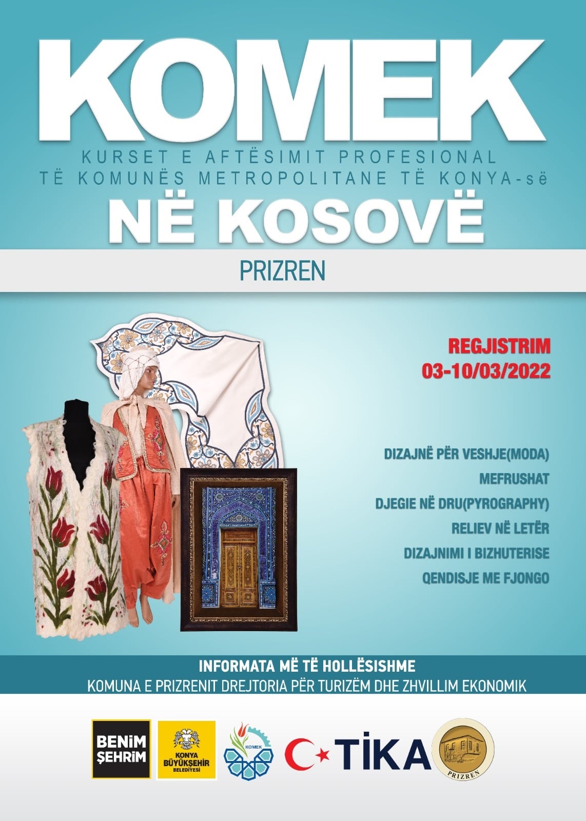 Komuna e Prizrenit në një postim në faqen zyrtare të saj, ka njoftuar se Drejtoria e Turizmit dhe Zhvillimit Ekonomik, përsëri ka filuar me kurset për aftësim për zanate dhe punime dore, kurset do të mbahen në fushat e poshtë shënuara: