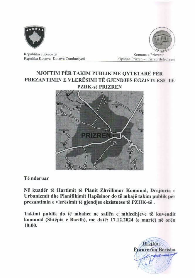 Drejtoria e Urbanizmit dhe Planifikimit Hapësinor në Prizren, njofton të gjithë qytetarët se në kuadër të hartimit të Planit Zhvillimor Komunal, organizon takim publik për prezantimin e vlerësimit të gjendjes ekzistuese të PZHK-së.