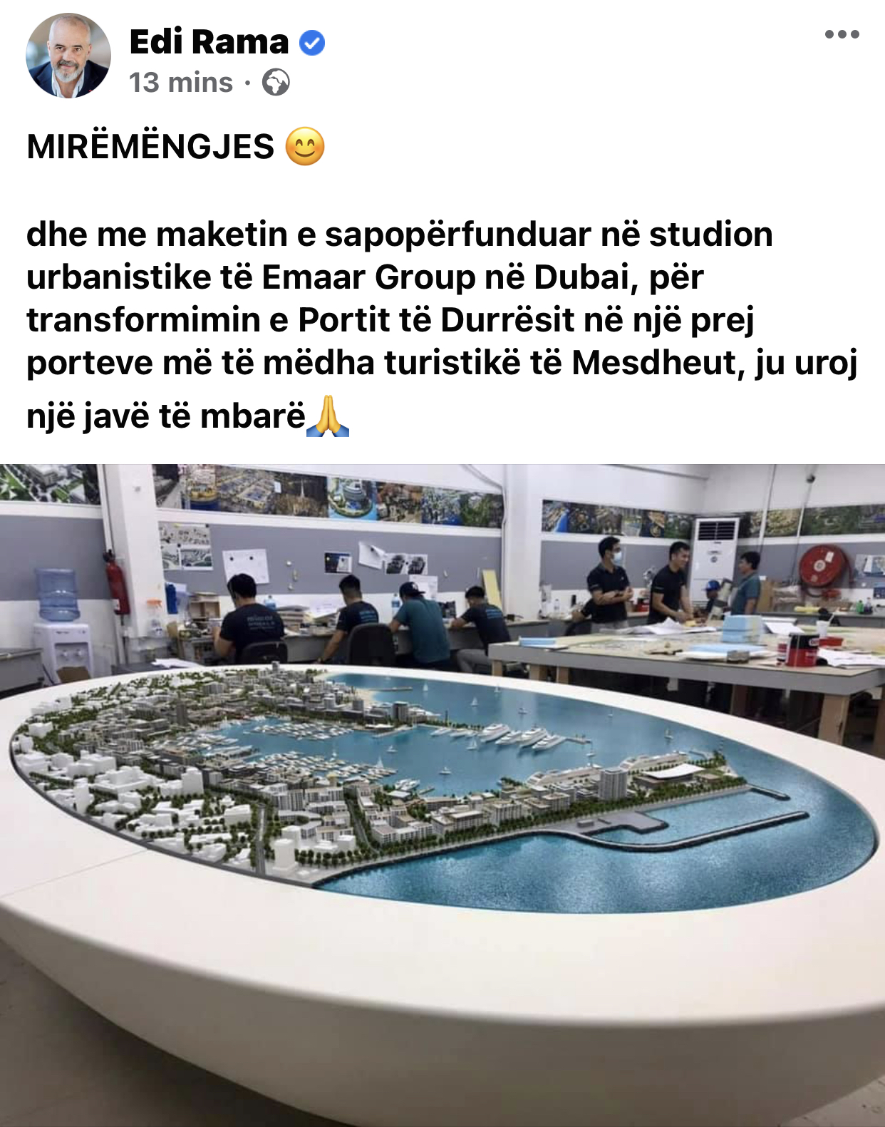 dhe me maketin e sapopërfunduar në studion urbanistike të Emaar Group në Dubai, për transformimin e Portit të Durrësit në një prej porteve më të mëdha turistikë të Mesdheut, ju uroj një javë të mbarë🙏