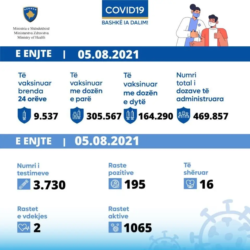 Ministria e Shëndetësisë, sipas të dhënave nga Instituti Kombëtar i Shëndetësisë Publike të Kosovës, informon se nga 3.730 testime, 195 qytetarë kanë rezultuar pozitiv me virusin COVID-19.