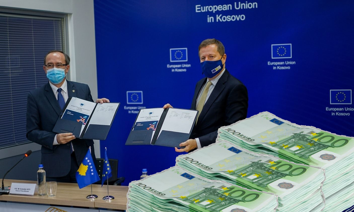 Kryeministri i Republikës së Kosovës, Avdullah Hoti dhe Ambasadori BE-së, Tomáš Szunyog, nënshkruan kontratën e përkrahjes buxhetore prej 26.5 milionë euro, që do t’i ndihmojnë Kosovës të adresojë pasojat e pandemisë COVID-19. Pagesa e parë prej 20.5 milionësh pritet që të realizohet para fundit të këtij viti.