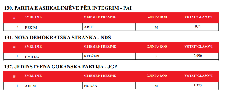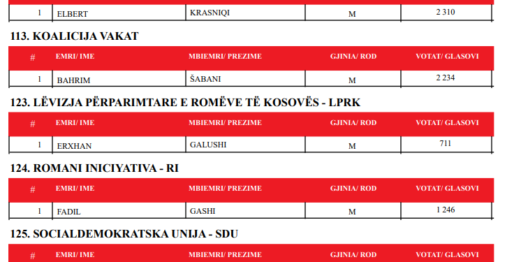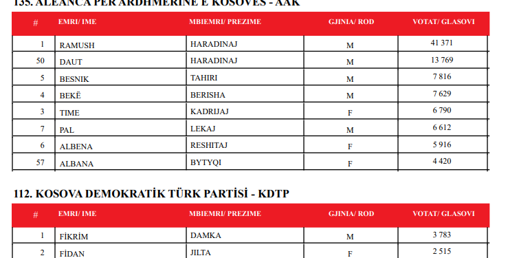 Me rezultatet përfundimtare, Vetëvendosja do të ketë 58 deputetë, PDK’ja 19, LDK’ja 15, Srpska Lista 10, AAK’ja 8, KDTP’ja 2, VAKAT 1, IRDK’ja 1, RI’ja 1, NDS’ja 1, SDU’ja 1, JGP’ja 1, PAI 1, LPRK’ja 1.
