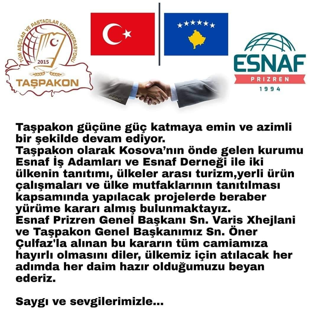 TAŞPAKON është një ndër organizatat më të mëdha joqeveritare të Turqisë, Konfederata e Gastronomëve dhe Shef Kuzhinjerëve – është marrë vendimi për nënshkrimin e protokollit për bashkëpunim për promovimin e turizmit reciprok, promovimin e shteteve dhe kulturën e kuzhinave.