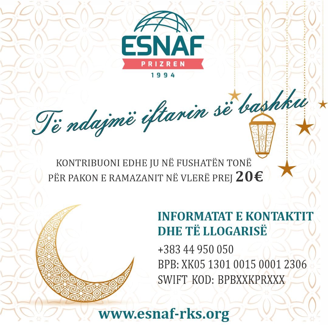 Shoqata e Zejëtarëve dhe Biznismenëve “Esnaf” në Prizren, përmes një njoftimi për media ka bërë të ditur se edhe këtë vit sikur vitin e kaluar në vend të Iftarit të cilën e organizojmë çdo vjet në natën e 15-të të çdo Ramazani, do të zëvëndësojmë duke dërguar Pako të Ramazanit për familjet me nevojë.