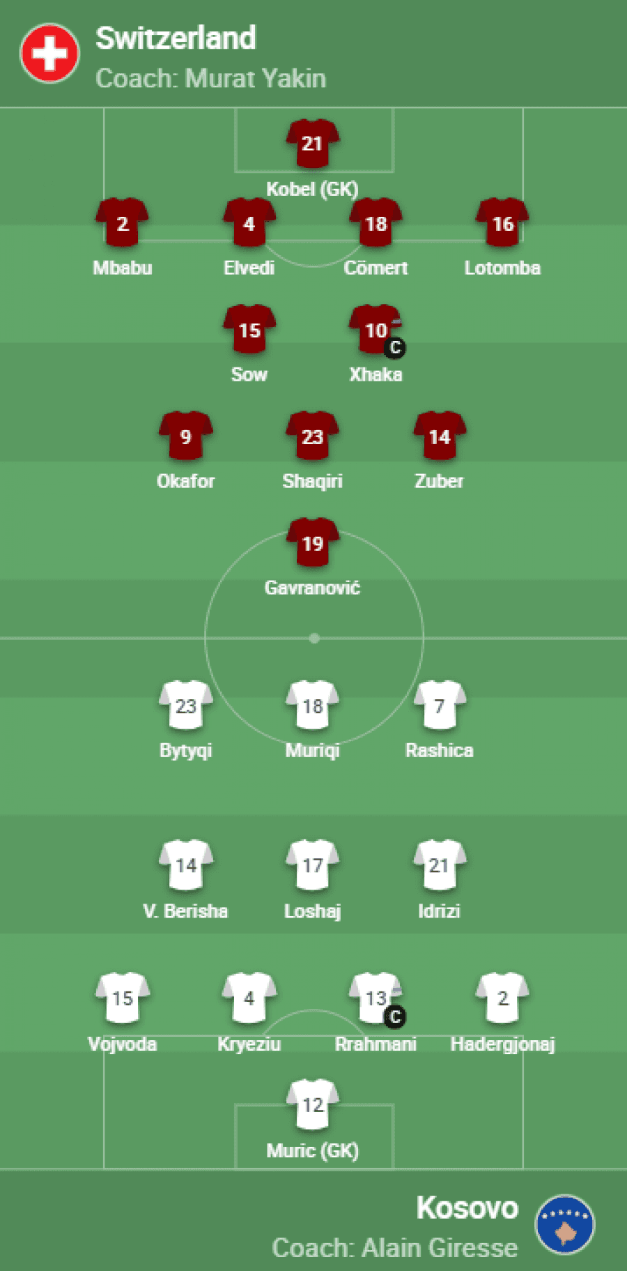 Xherdan Shaqiri dhe Granit Xhaka startojnë nga minuta e parë te helvetikët. Për Xhakën, që është edhe kapiten i skuadrës, do të jetë paraqitja e 100-të jubilare me Zvicrën. Andi Zeqiri është në bankën rezervë.