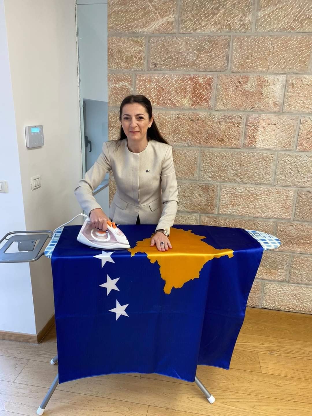 Në fotografi ajo duket ndërsa me kujdes të shtuar hekuros flamurin kosovar, sigurisht për paraqitje dhe prezantim sa më të bukur në selinë e Ambasadës së Kosovës në Jerusalem.