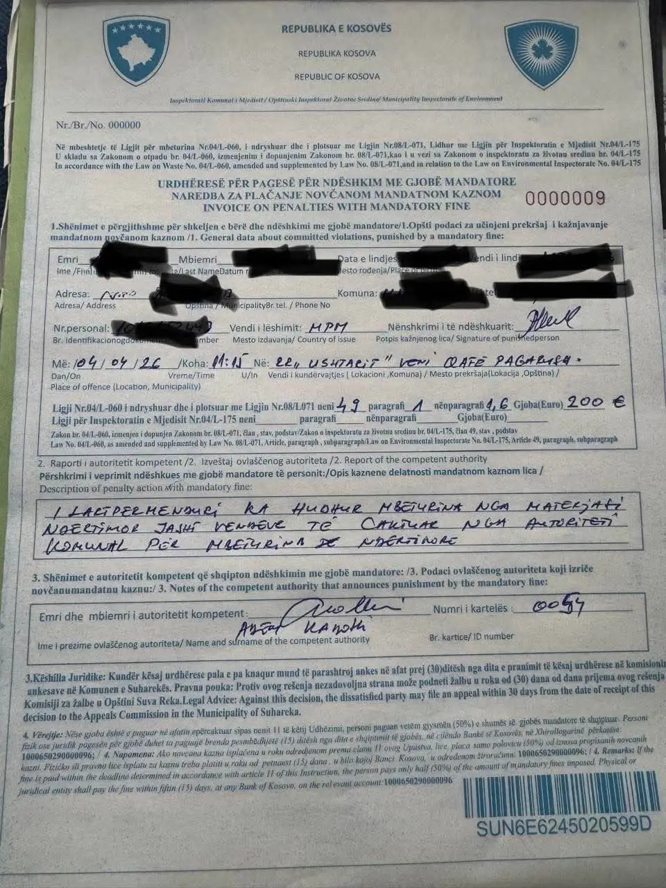 Kryetari i Komunës së Suharekës, Bali Muharremaj, ka njoftuar se është shqiptuar gjobë prej 200 euro ndaj personit që kishte hedhur mbeturina në mënyrë të paligjshme në fshatin Dobërdelan, duke dëmtuar hapësirën publike.