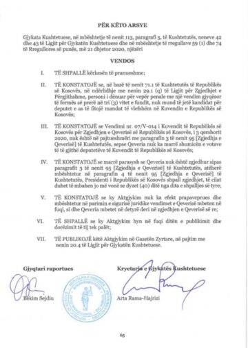 Gjykata Kushtetuese e Kosovës ka bërë publike përmbledhjen e vendimit për “Vlerësim i kushtetutshmërisë së Vendimit të Kuvendit të Republikës së Kosovës nr. 07/V-014, të 3 qershorit 2020, për Zgjedhjen e Qeverisë së Republikës së Kosovës”.Ky është vendimi i cili ka dërguar Kosovën në zgjedhje të jashtëzakonshme, përcjellë Gazeta Blic.