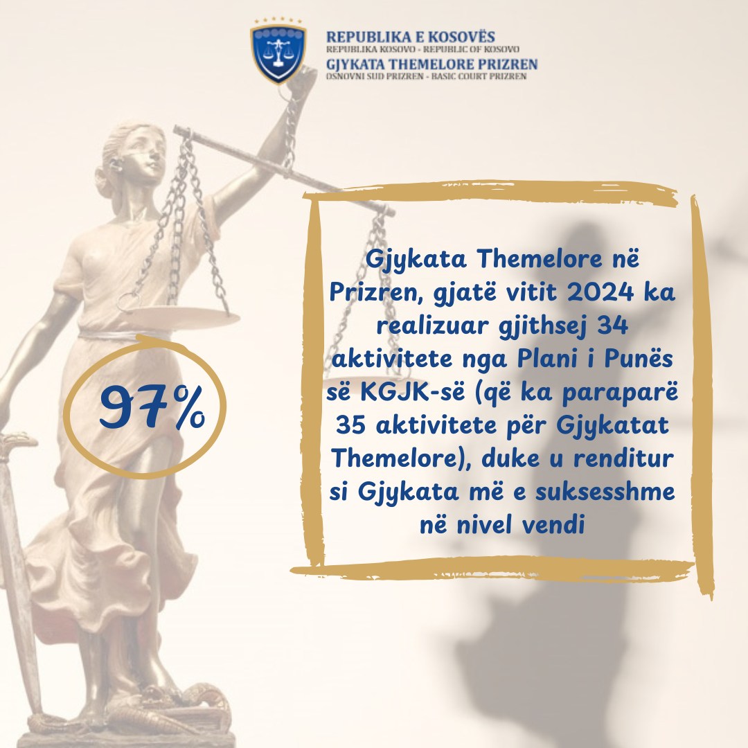 Gjykata Themelore e Prizrenit ka arritur rezultate të shkëlqyera në realizimin e aktiviteteve të planifikuara për vitin 2024, duke realizuar gjithsej 34 aktivitete nga 35 të planifikuara.