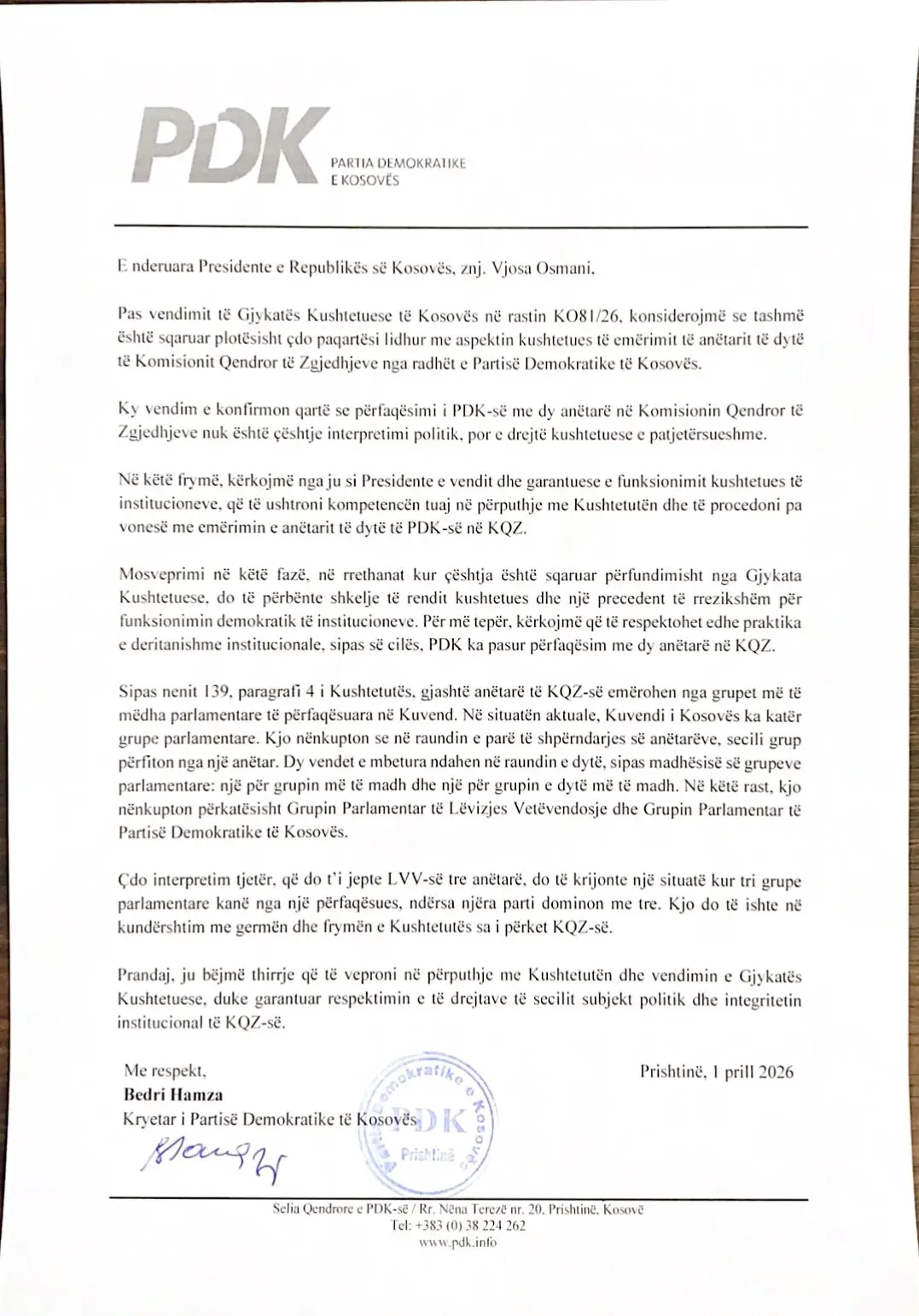 Kryetari i Partisë Demokratike të Kosovës, Bedri Hamza, i ka dërguar një letër zyrtare presidentes së vendit, Vjosa Osmani, duke kërkuar që të procedohet pa vonesë me emërimin e anëtarit të dytë të PDK-së në Komisionin Qendror të Zgjedhjeve.