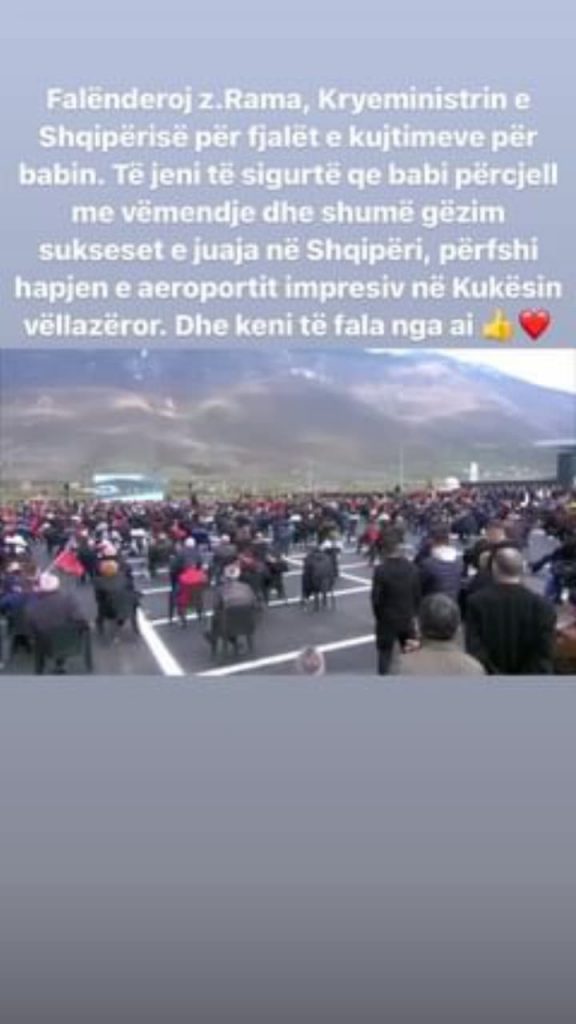 Nuk e di prej këtu a më ndjek, por do të doja t’i çoja një përqafim dhe t’i thosha se në muret e këtij aeroporti gjendet edhe një moment i jashtëzakonshëm, momenti kur Hashim Thaçi dhe Ibrahim Rugova të ulur së bashku, i hapën rrugë çlirimit përfundimtar të Kosovës”.