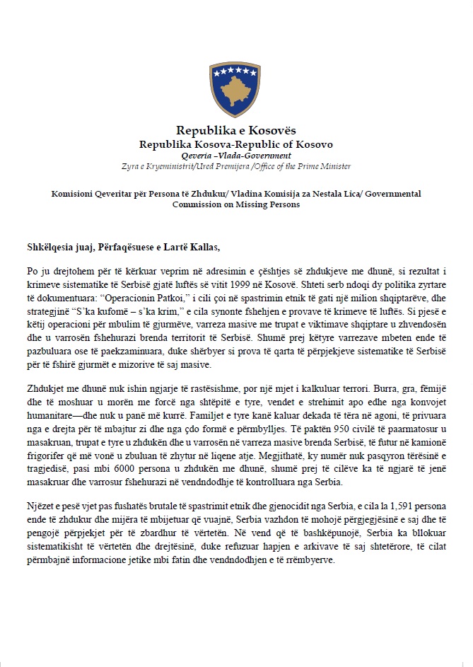 Ai njoftoi se Qeveria e Kosovës ka dërguar një letër drejtuar Përfaqësueses së Lartë për Punët e Jashtme dhe Politikën e Sigurisë të BE-së, Kaja Kallas, ku kërkohet hapja e arkivave shtetërore të Serbisë, përfshirë ato ushtarake, policore dhe të inteligjencës, të cilat përmbajnë informacione kyçe mbi vendndodhjen e të zhdukurve.