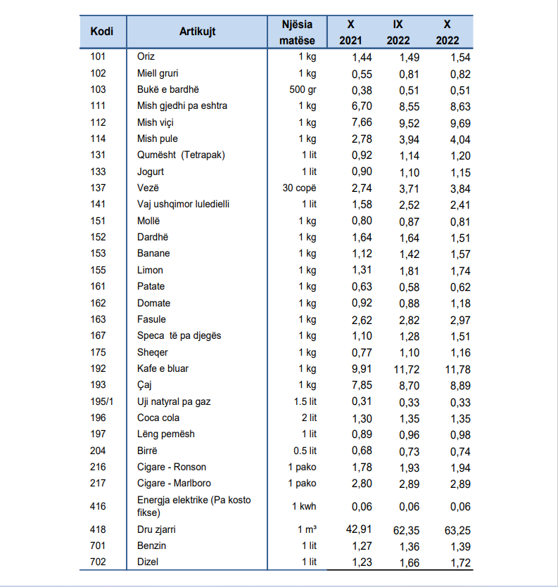 “Indeksi i tërësishëm i harmonizuar i çmimeve të konsumit është më i lartë në një mesatare prej 12.7% në muajin tetor 2022, krahasuar me muajin tetor 2021. Kjo kryesisht është shpjeguar me ngritjen e çmimeve të konsumit në këtë periudhë të nëngrupet e COICOP-it: lëndë djegëse të ngurta, dru zjarri, pelet, etj. (56.6%); vajra dhe yndyra ushqimore (42.7%); bukë dhe drithëra (29.5%); qumësht, djathë dhe vezë (27.1%); mish (22.9%); sheqer, reçel, mjaltë, çokollata dhe ëmbëlsira (21.5%); karburante dhe lubrifikantë për pajisjet e transportit personal (20.8%); prodhime të ndryshme ushqimore, salca, erëza, kripë, ushqim për fëmijë, etj. (17.1%); mallra dhe shërbime për mirëmbajtjen e zakonshme të ekonomisë shtëpiake (16.4%); gaz (16.1%); kafe, çaj dhe kakao (15.1%); mirëmbajtje dhe rregullim i vendbanimit (14.9%); shërbime hoteliere (13.9%); vegla dhe pajisje për shtëpi dhe kopsht (11.0%)”.