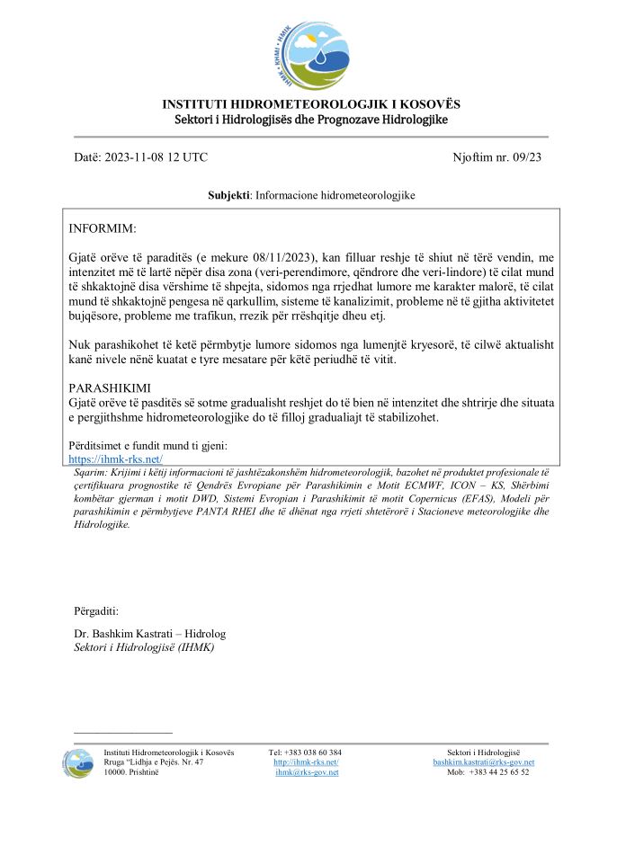 Gjatë orëve të paraditës (e mekure 08/11/2023), kanë filluar reshje të shiut në tërë vendin, me intensitet më të lartë nëpër disa zona (veri-perëndimore, qendrore dhe veri-lindore) të cilat mund të shkaktojnë disa vërshime të shpejta, sidomos nga rrjedhat lumore me karakter malor, të cilat mund të shkaktojnë pengesa në qarkullim, sisteme të kanalizimit, probleme në të gjitha aktivitetet bujqësore, probleme me trafikun, rrezik për rrëshqitje dheu etj”, thuhet në njoftim e IHMK-së.